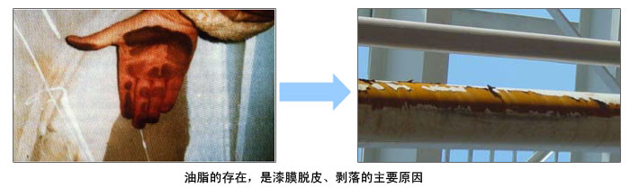 大多數(shù)涂料與油脂有著排斥力,大于油脂的吸引力。底材有油脂就會引起縮孔、附著力差等問題。而且越是高性能的涂料如環(huán)氧,聚氨酯涂料,此時的附著力越不如常規(guī)的油性涂料。大量的油脂先要刮去,而后用溶劑(脂肪烴或松香水)擦洗,然而這往往使油污表面擴大,情況更糟。所以要重復幾次,每次用干凈的抹布擦過才有效。商用化學清洗劑對除油很有效,但必須確認對涂層無害。用熱水清洗也很有效。