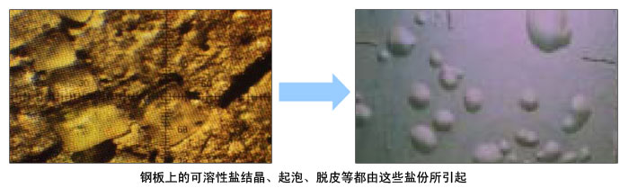 硫酸鐵、氯化亞鐵等可溶性鹽不僅直接破壞著涂層,引起滲壓起泡,附著力差等,它還是一種催化劑,會加劇腐蝕。除去可溶性鹽的最好方法進行高壓淡水沖洗,表面不平以及有縫隙的舊漆膜包括失效或海綿狀的防污漆膜內(nèi)極易藏納鹽垢,更要仔細沖洗。